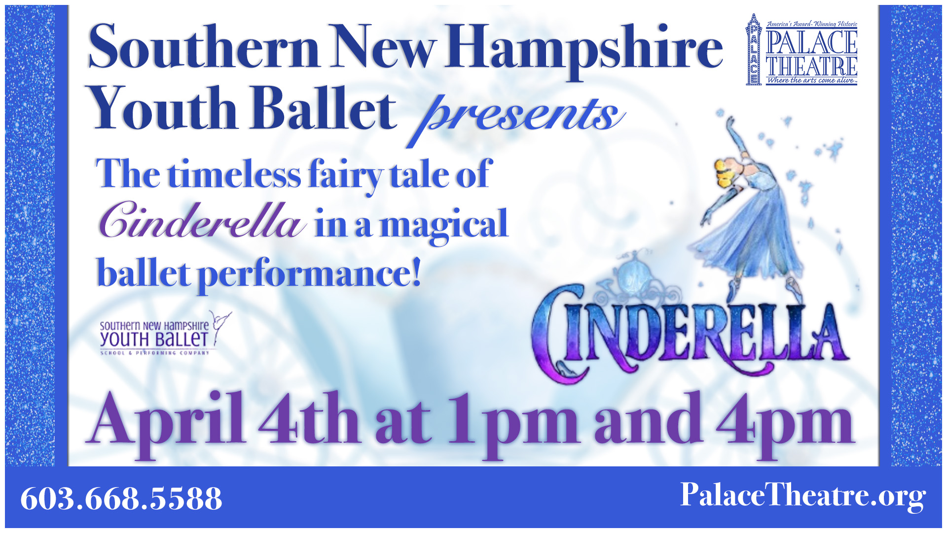 Southern New Hampshire Youth Ballet presents the timeless fairy tale of Cinderella in a magical ballet performance sure to delight audiences of all ages. Follow Cinderella’s journey from rags to royal ball as exquisite dancing, beautiful costumes, and enchanting music bring this beloved story to life. Perfect for princesses, princes, and budding ballerinas alike, this performance runs approximately 75 minutes, including a 10-minute intermission.