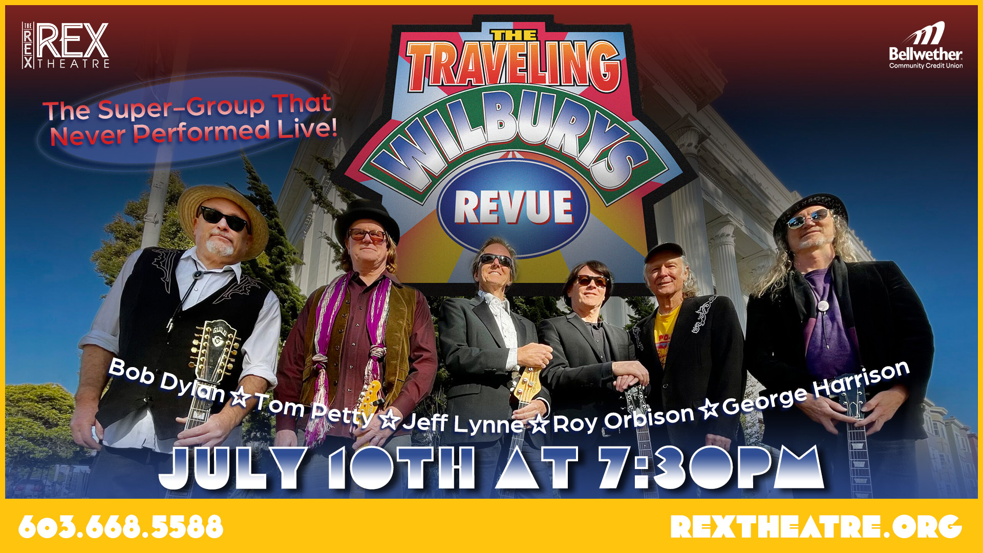 THE TRAVELING WILBURYS REVUE brings that music of the WILBURYS and the hits from each of these individual artists to every show. Here Comes The Sun, Won’t Back Down, Pretty Woman, Like A Rolling Stone, Don’t Bring Me Down, and more that everyone knows and loves. Now fans can finally see and hear these great songs at every performance of THE TRAVELING WILBURYS REVUE!