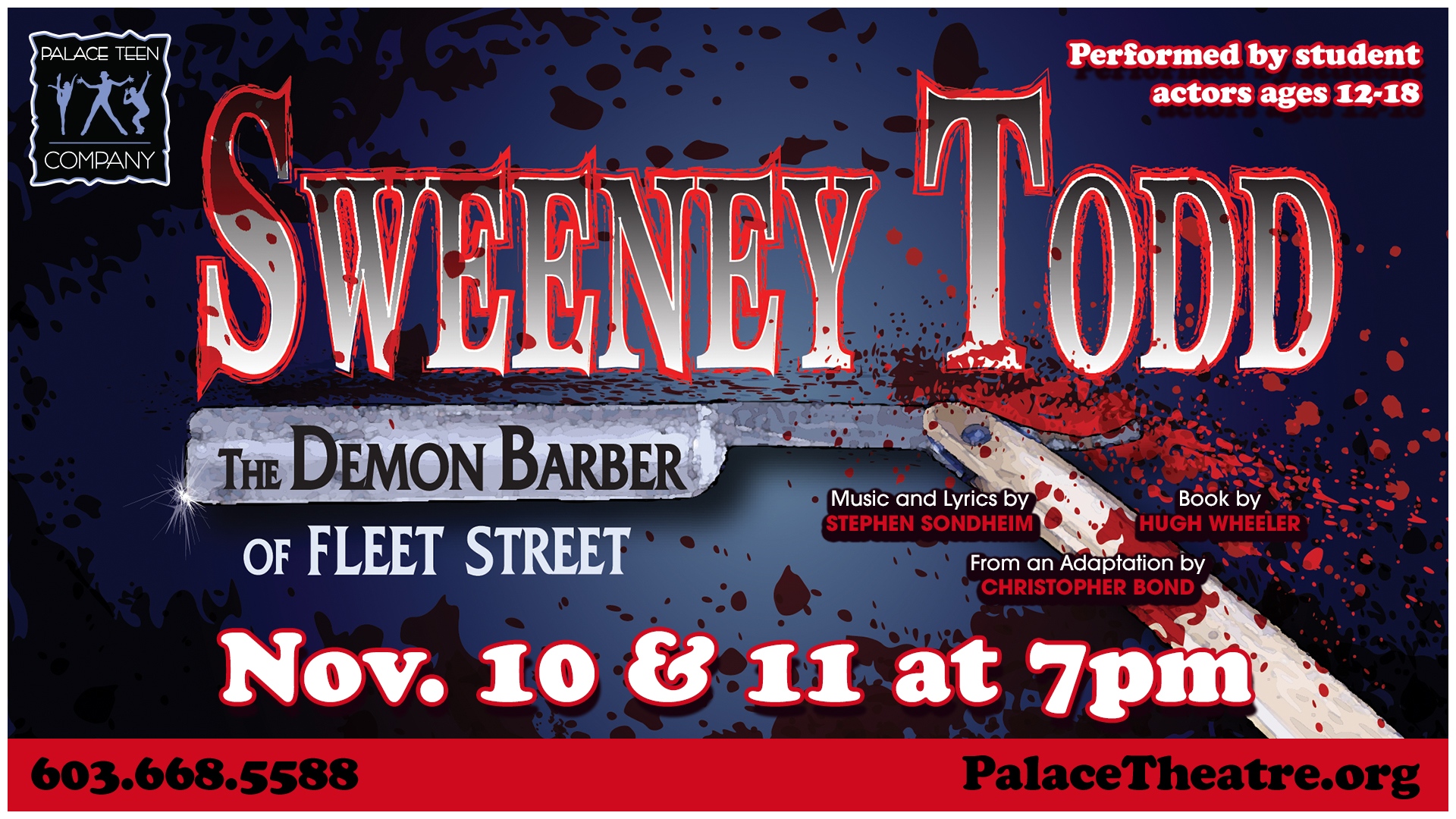 Performed by student actors ages 12-18. An infamous tale, Sweeney Todd, an unjustly exiled barber, returns to nineteenth century London, seeking vengeance against the judge who framed him. The road to revenge leads Todd to Mrs. Lovett, a resourceful proprietress of a failing pie shop, above which, he opens a new barber practice. Mrs. Lovett’s luck sharply shifts when Todd’s thirst for blood inspires the integration of an ingredient into her meat pies that has the people of London lining up… and the carnage has only just begun! Buy Tickets SWEENEY TODD The Demon Barber of Fleet Street A Musical Thriller Music and Lyrics by STEPHEN SONDHEIM Book by HUGH WHEELER From an Adaptation by CHRISTOPHER BOND Originally Directed On Broadway by HAROLD PRINCE Orchestrations by Jonathan Tunick Originally Produced on Broadway by Richard Barr, Charles Woodward, Robert Fryer, Mary Lea Johnson, Martin Richards in Association with Dean and Judy Manos Sweeney Todd Is presented through special arrangement with Music Theatre International (MTI). All authorized performance materials are also supplied by MTI. www.mtishows.com ANY VIDEO AND/OR AUDIO RECORDING OF THIS PRODUCTION IS STRICTLY PROHIBITED.