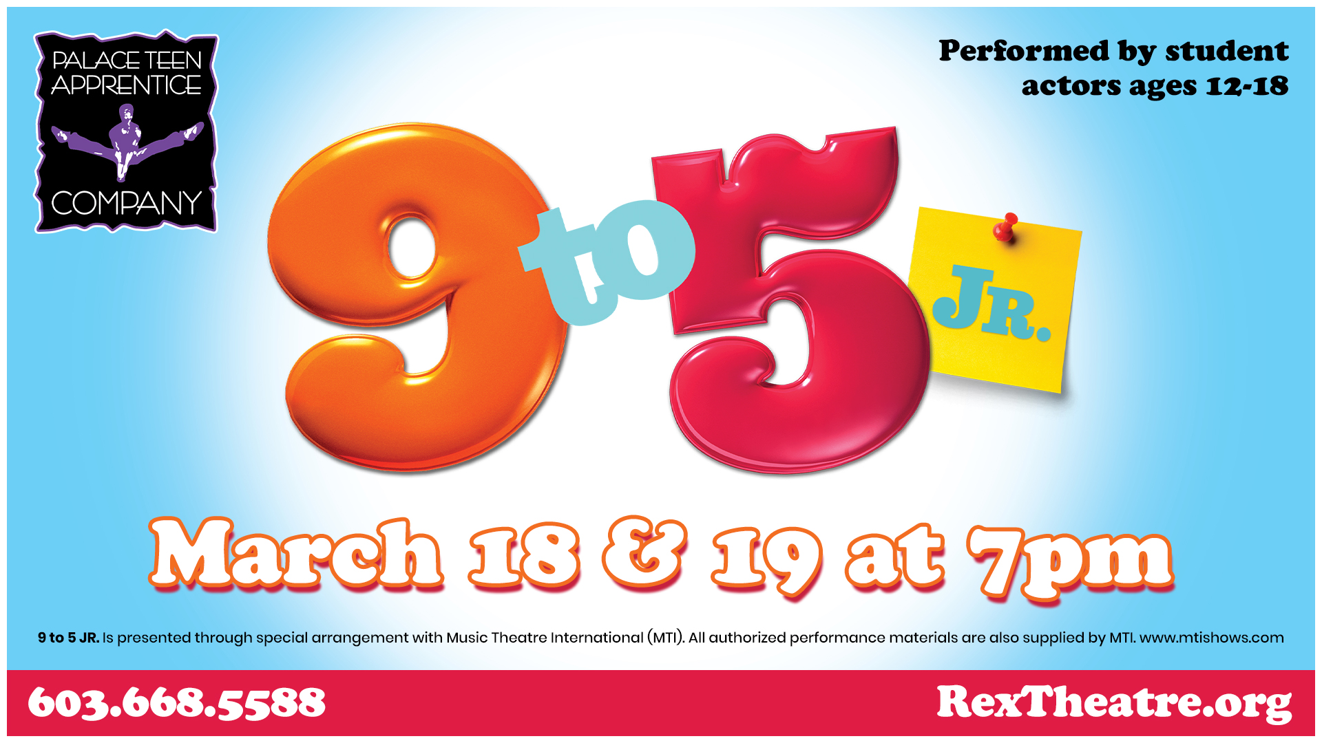 Performed by the Palace Teen Apprentice Company (student actors ages 12-18). Set in the late 1970s, this hilarious story of friendship and empowerment in the Rolodex era has a message for today. Although coworkers Violet, Judy and Doralee are as different as could be, they have one thing in common: their bully of a boss, Mr. Hart, makes their lives miserable. Together, they concoct a plan to liberate their office from his reign. In a hilarious turn of events, the trio gives their workplace a dream makeover, taking control of the company that had always kept them down.   Buy Tickets   Palace Youth Theatres Production of 9 to 5 JR. Music and Lyrics by Dolly Parton Book by Patricia Resnick Originally produced on Broadway by Robert Greenblatt, April 2009 Original Broadway Orchestration BRUCE COUGHLIN Original Broadway Arrangements and Additional Orchestrations STEPHEN OREMUS & ALEX LACAMOIRE New Orchestrations and Arrangements MARK CROSSLAND 9 to 5 JR. Is presented through special arrangement with Music Theatre International (MTI). All authorized performance materials are also supplied by MTI. www.mtishows.com ANY VIDEO AND/OR AUDIO RECORDING OF THIS PRODUCTION IS STRICTLY PROHIBITED.